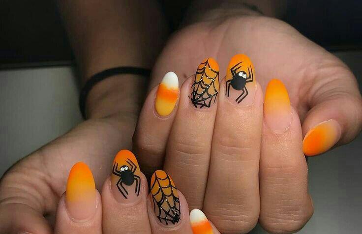 Soft candy corn ombré nails paired with spiderweb and spider details, balancing sweetness with just the right amount of creepy.