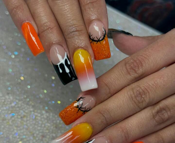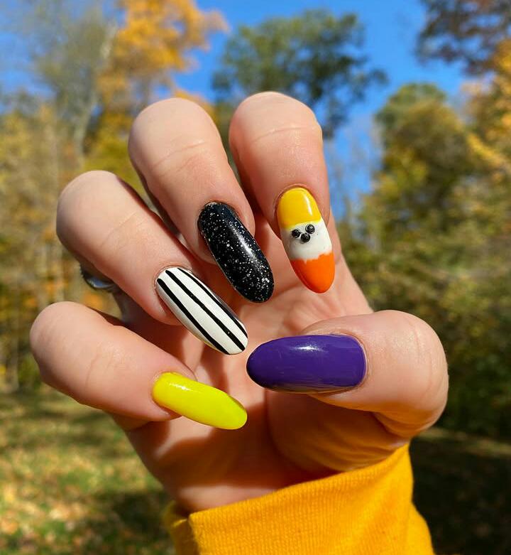 A mix of candy corn ombré, glitter, and spooky black-and-white drip details for a bold Halloween look.