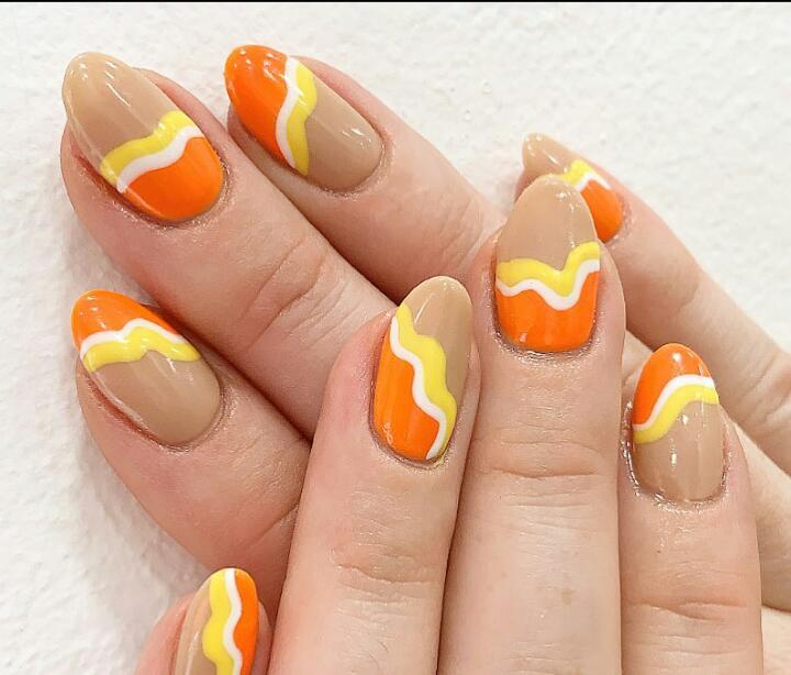 Neutral beige nails with wavy orange, yellow, and white accents create a subtle candy corn-inspired style.