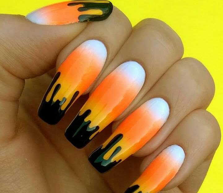 A long, bold design with candy corn ombré bases topped by glossy black drips, creating a dramatic “melting” effect.