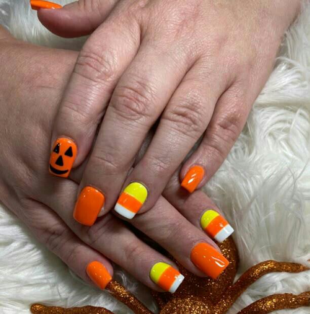 Bright orange nails with candy corn tips and a jack-o’-lantern accent nail for a cheerful, classic Halloween theme.