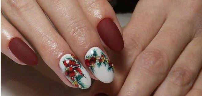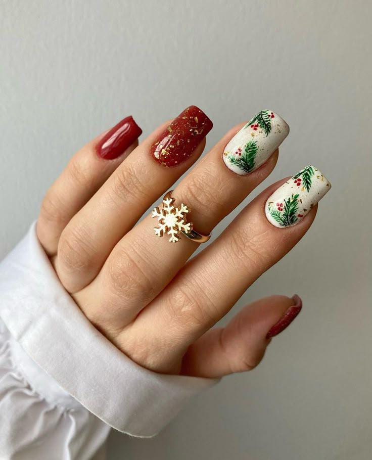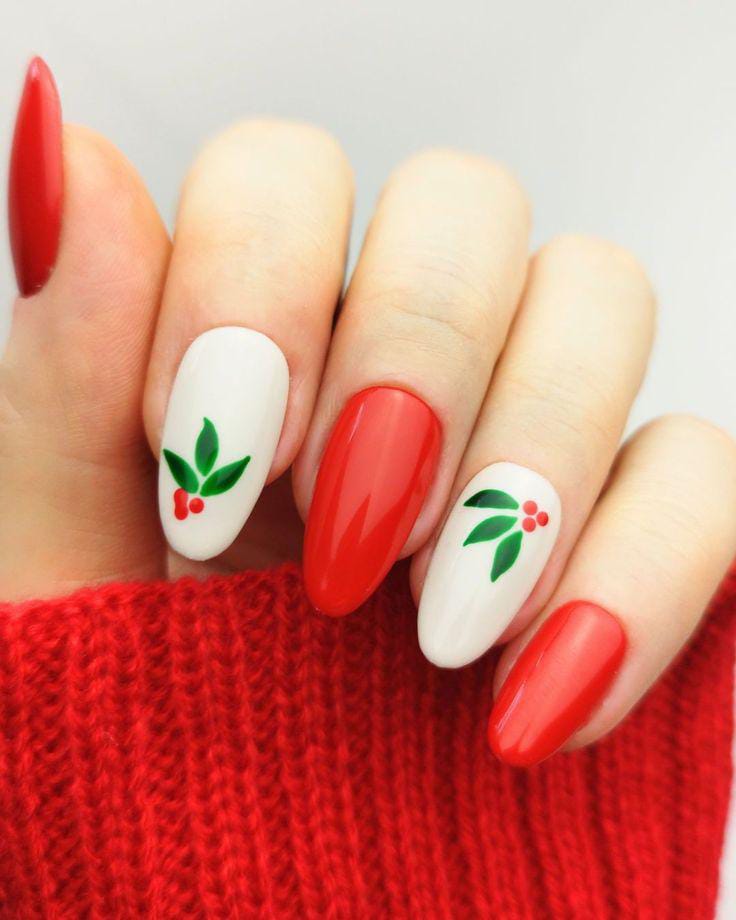 A classy mix of deep matte red and crisp white nails adorned with holly leaves and red berries. The design feels warm and sophisticated, perfect for a subtle Christmas statement.