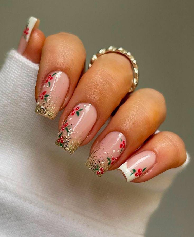 Soft nude nails fade into golden glitter at the tips, adorned with small holly berry details for a chic, sparkling design that feels both classy and Christmassy.