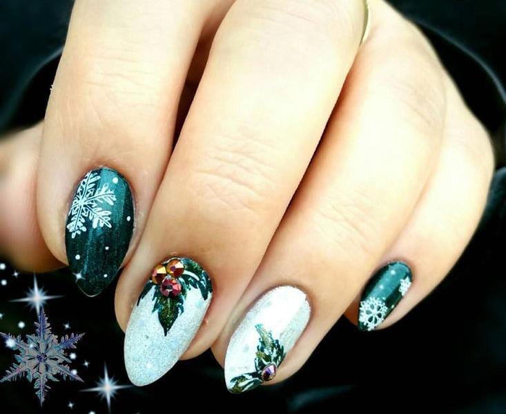 Matte green and beige nails accented with snowflakes and holly leaves capture the essence of a snowy Christmas evening — festive yet sophisticated.