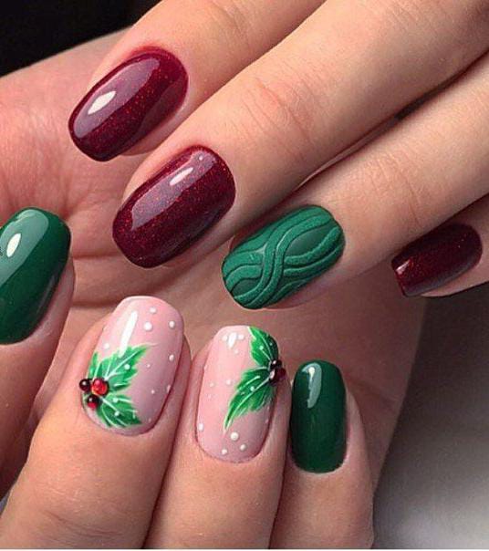 Glossy red and green nails blend beautifully with nude pink accents decorated with holy art and a knitted sweater pattern. The combination feels both cozy and festive.