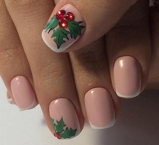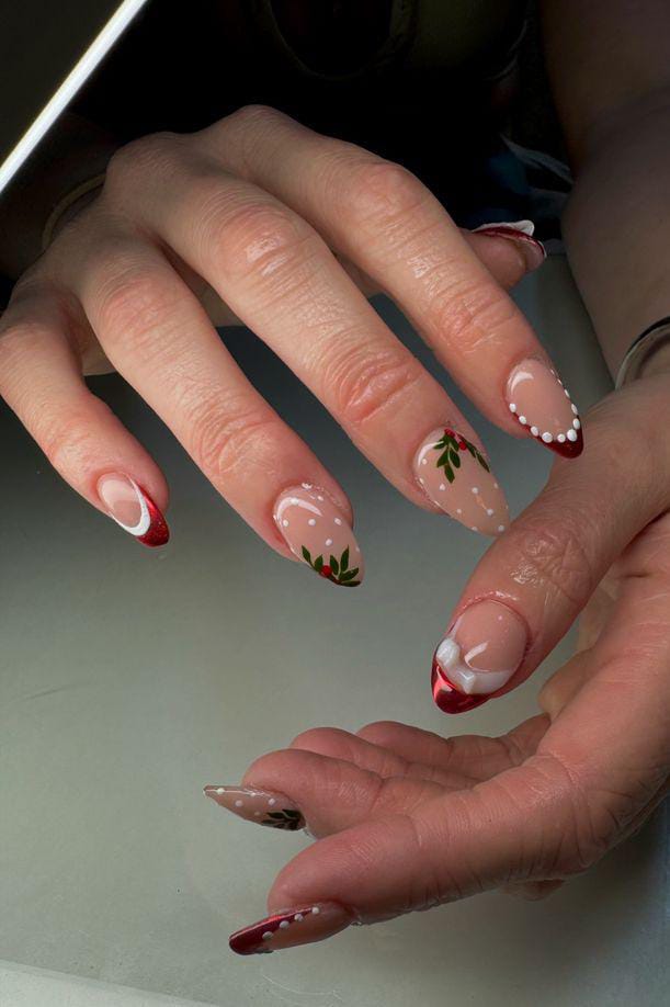 This modern French manicure features nude bases with red tips and holly leaf accents, offering a bold and stylish Christmas festive update.