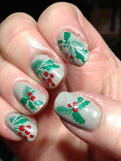 Light gray nails serve as a backdrop for vivid green holly leaves and bright red berries. The design is cheerful, traditional, and full of Christmas spirit.