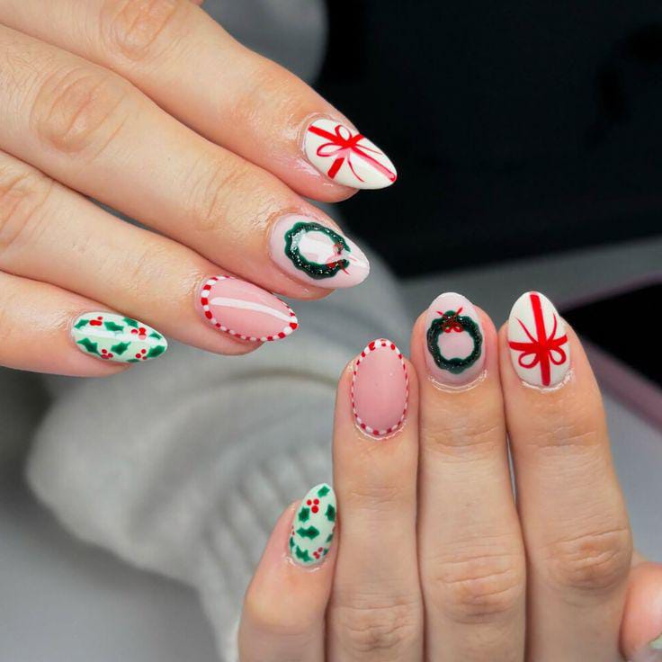 A playful holiday mix of red, green, and white featuring tiny wreaths, holly accents, and red bow details — a cheerful, cozy Christmas look.