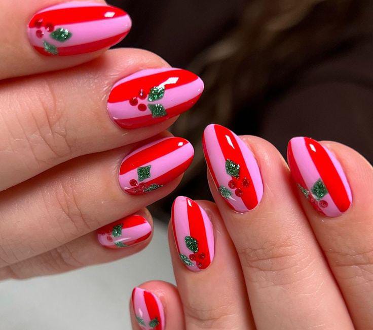 Bold red and pink stripes paired with glittery green holly leaves and berries create a fun, candy-cane-inspired Christmas festive design.