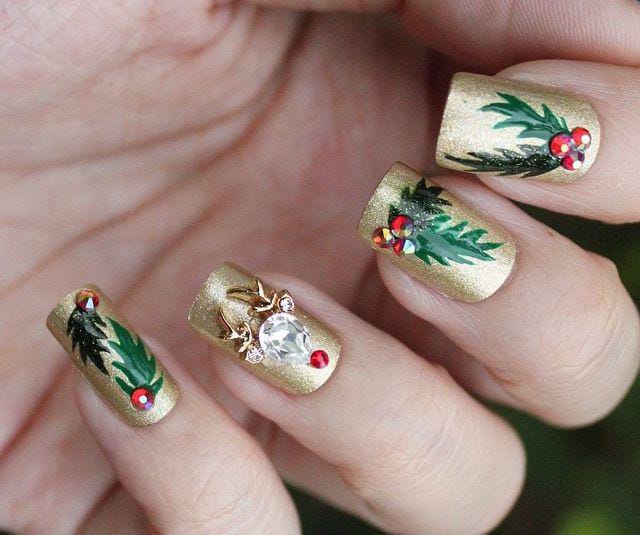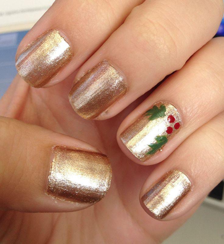 Shimmering gold polish serves as a luxe base, topped with subtle holly leaf and berry accents for an elegant Christmas holiday touch.