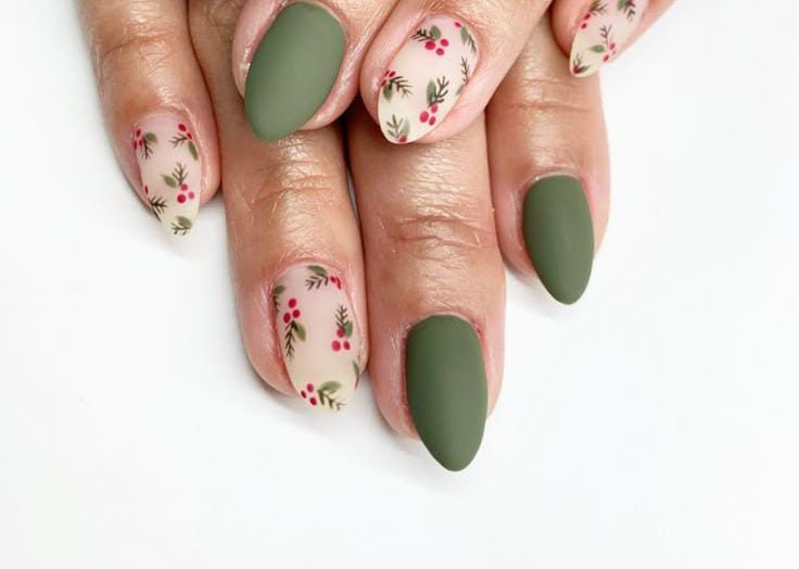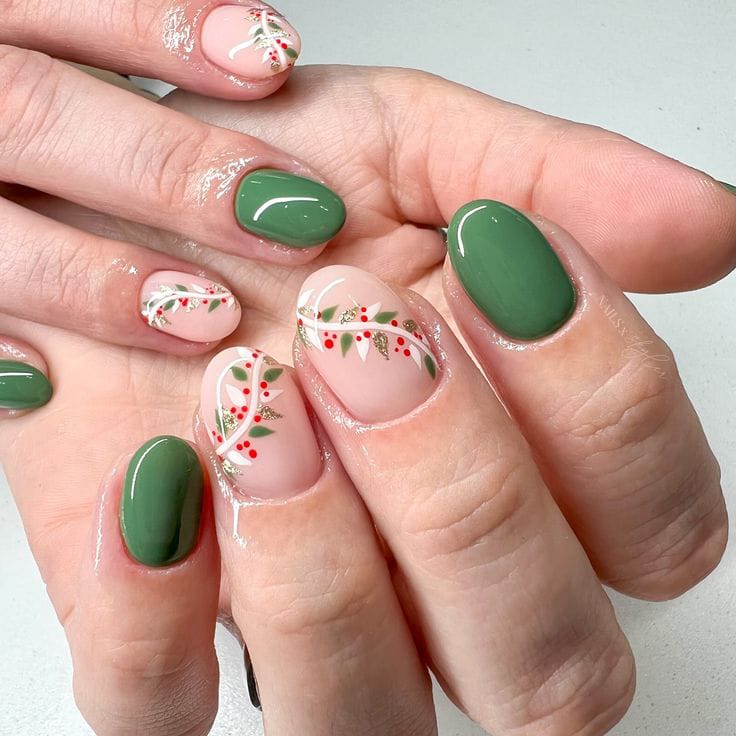 Soft matte olive green nails paired with neutral tones and delicate holly designs, creating a cozy and nature-inspired Christmas vibe.