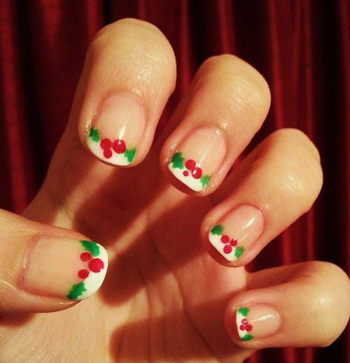 Natural nails with white French tips adorned by petite holly leaves and berries give a minimal yet charming Christmas holiday vibe.