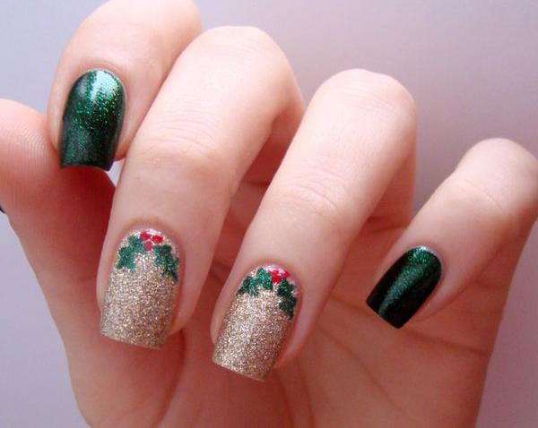A mix of rich green and glittery gold nails, accented with tiny holly clusters, brings a sophisticated Christmas glow with a touch of luxury and warmth.
