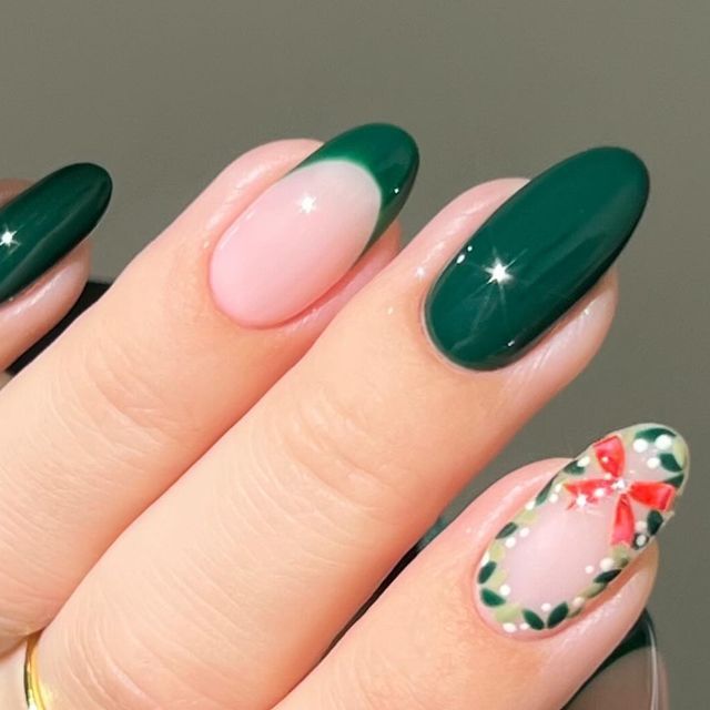 Deep green nails paired with a nude base and a holly wreath accent topped with a red bow create a refined, modern holiday look that’s both chic and cheerful at Christmas.