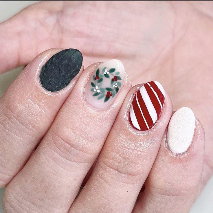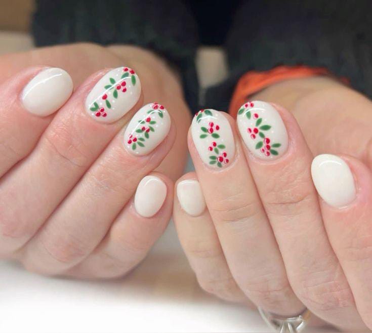 Warm cream nails with leafy green and red holly accents arranged in wreath-like patterns, offering a charming, handmade Christmas feel.