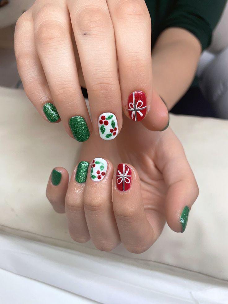 This bold red, green, and white combo captures the true Christmas spirit with glittering green nails, holly berry accents, and a cute gift bow design for a joyful, festive finish.