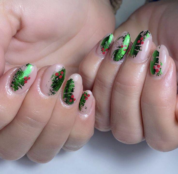 A transparent nude base with shimmery green foil like holly leaves, brush strokes and tiny red berry clusters gives this look a Christmas festive yet edgy winter feel.