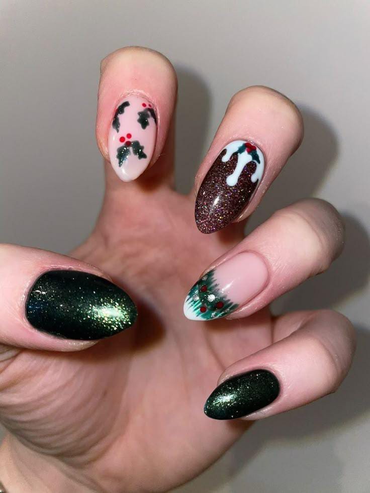 Dark green shimmer nails mix with playful holly and pudding-inspired art for a fun, Christmas festive twist that feels both sweet and sophisticated.