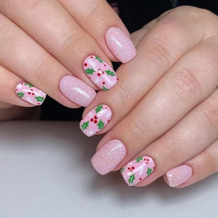 A pastel pink base with sparkly shimmer and scattered holly patterns delivers a cheerful, candy-like Christmas aesthetic that’s bright and joyful.