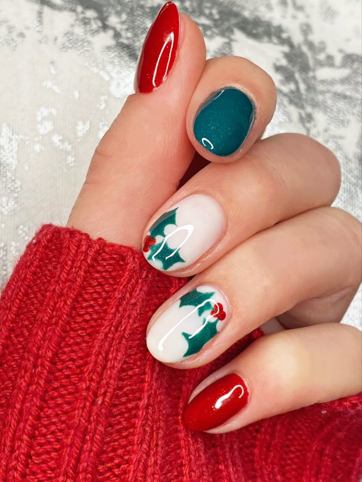 A festive mix of glossy red, teal, and white nails accented with green holly leaves and red berries, creating a clean yet joyful Christmas holiday vibe.