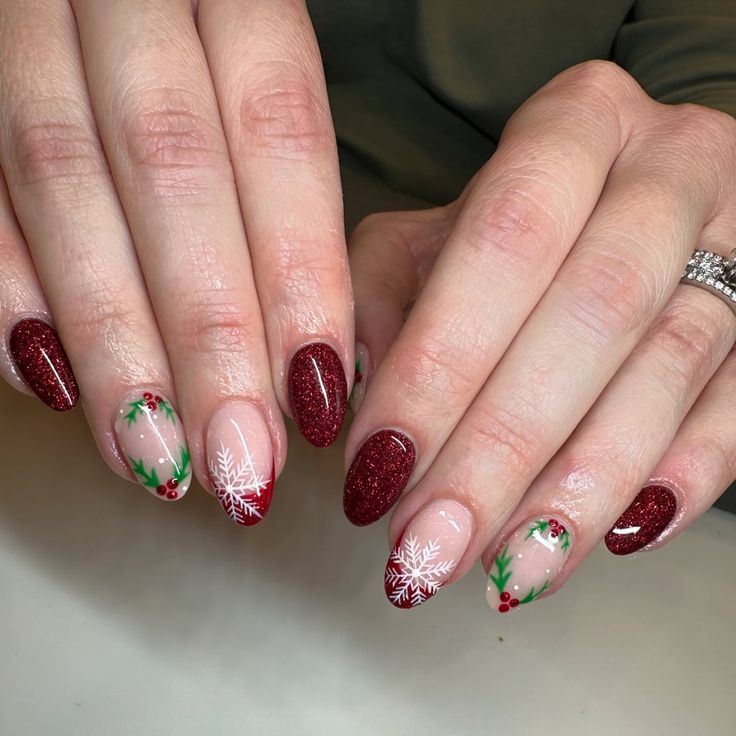 Deep red glitter nails paired with nude bases featuring hand-painted holly and snowflakes, blending elegance with Christmas sparkle.