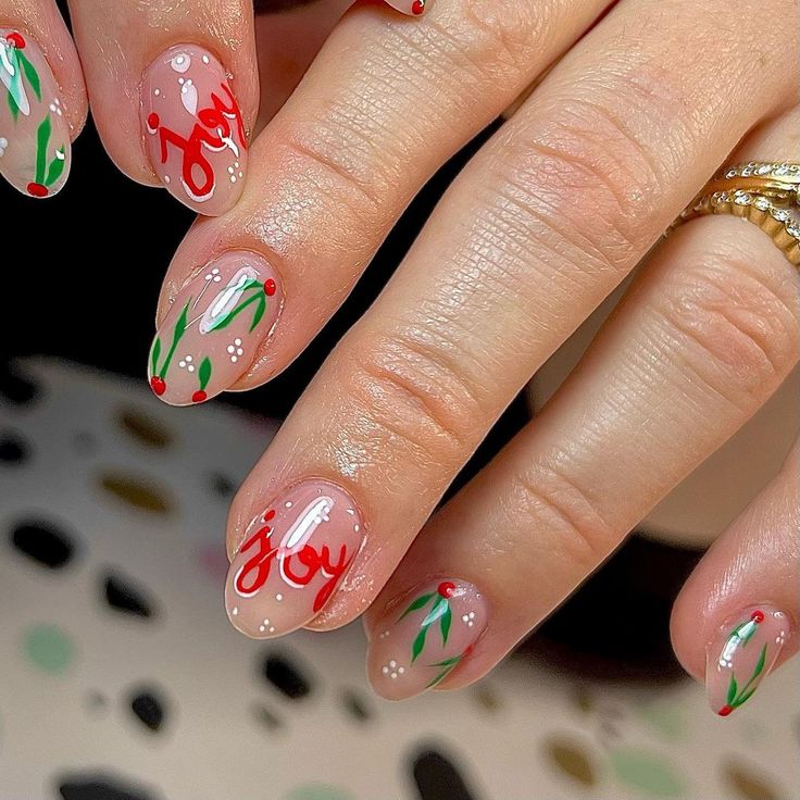 Soft nude nails decorated with playful red “Joy” lettering, holly leaves, and tiny white snow dots for a cheerful and cozy Christmas holiday look.