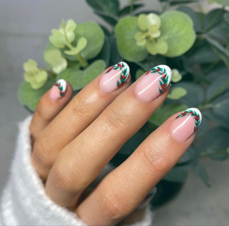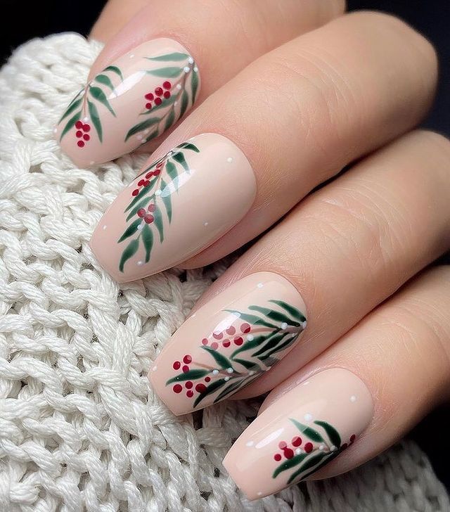 Neutral beige nails adorned with delicate green holly branches and red berries, giving a subtle and sophisticated Christmas festive touch.
