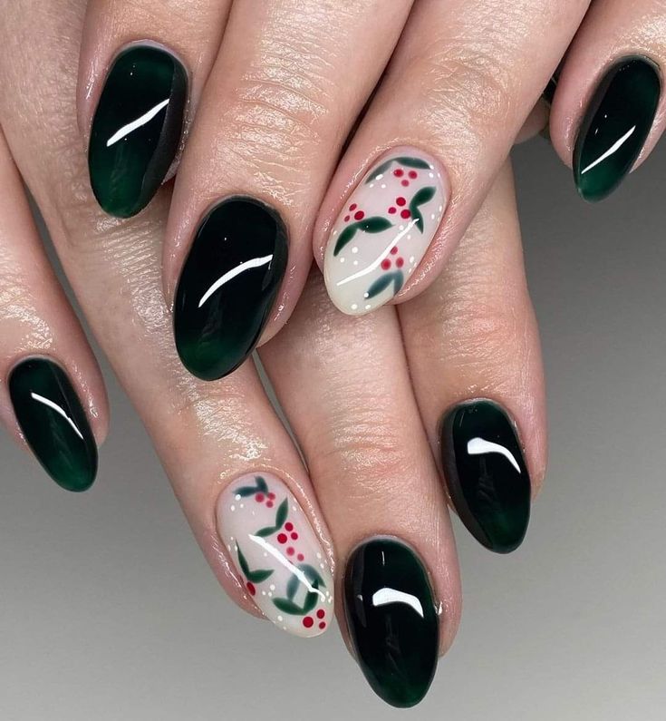 A deep forest green ombré paired with accent nails featuring dainty holly leaves and red berries over a soft nude base — elegant Christmas festive in a minimal way.