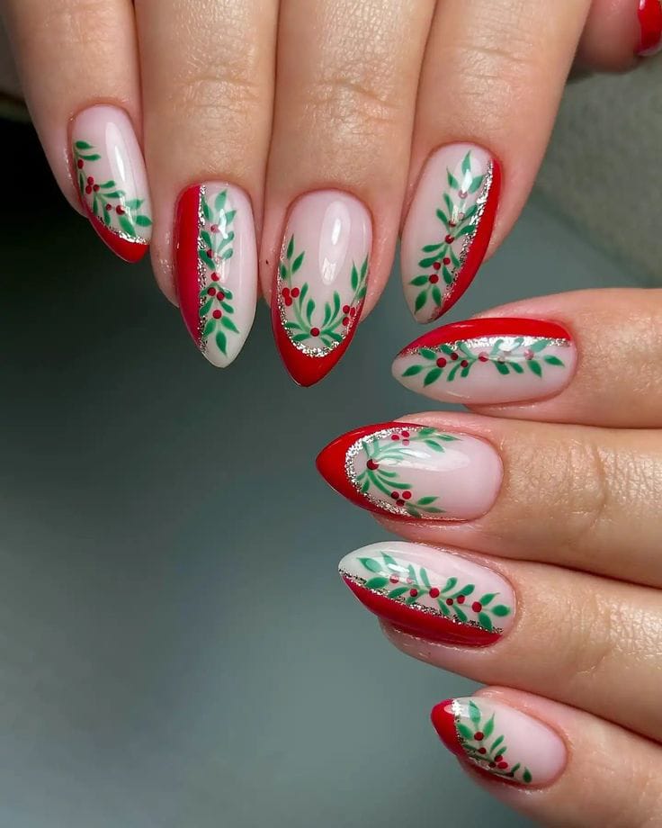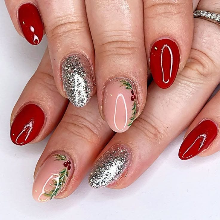 This design combines bold red polish, shimmering silver glitter, and soft nude nails accented with delicate holly leaves and berries. It’s festive and elegant with a perfect mix of sparkle and subtle Christmas holiday charm.