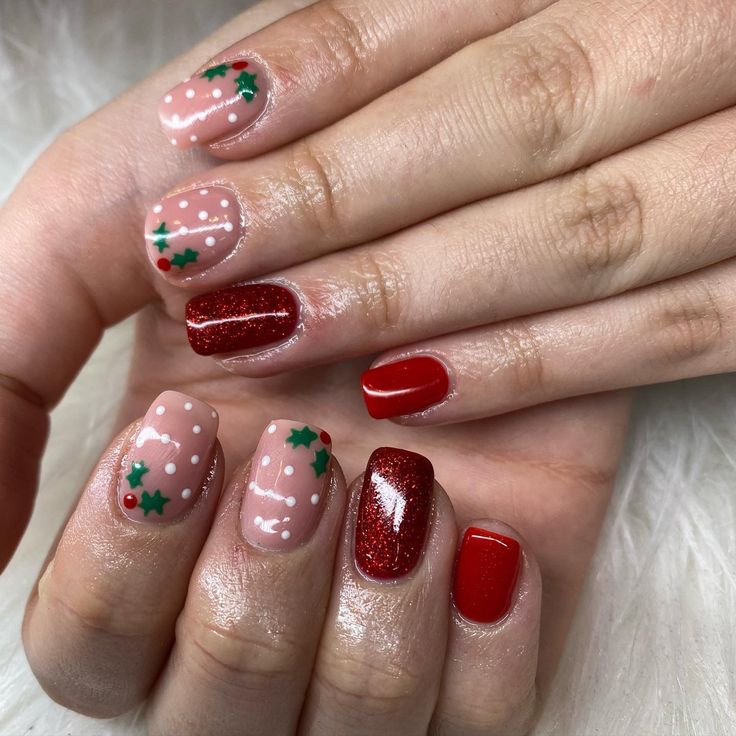 Glossy red glitter nails paired with nude accents featuring hand-painted holly leaves and berries create a timeless, cozy Christmas look.