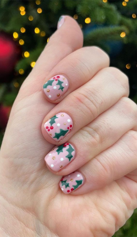 A short, rounded nail look with pink-toned nude polish, decorated with holly leaves, berries, and touches of gold dots. It’s whimsical and warm, capturing the heart of the Christmas holiday spirit.