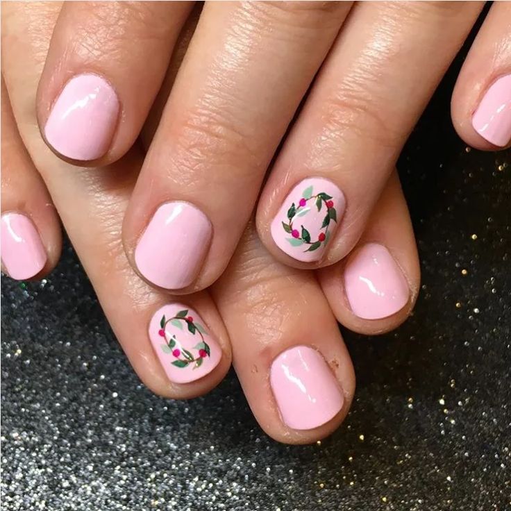 A delicate pastel pink base with tiny green holly leaf wreaths and red berry accents gives this design a simple yet festive charm — perfect for a subtle Christmas touch.