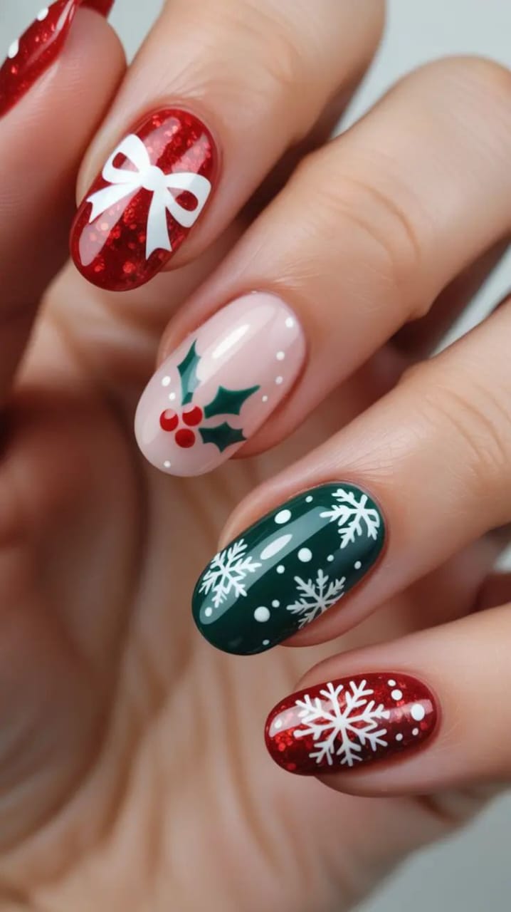 Rich red glitter, deep green, and soft nude nails blend with white snowflakes, bows, and holly accents, creating a playful and vibrant Christmas holiday vibe.