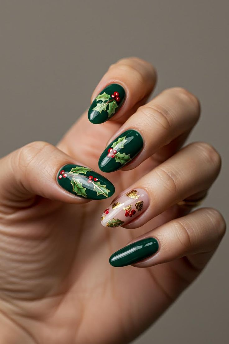 Dark green nails paired with gold and nude accents, adorned with detailed holly leaves and red berries, bring a sophisticated Christmas feel.