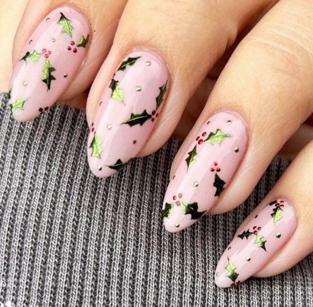 Pale pink nails covered with shiny holly leaf patterns and tiny gold dots, adding a subtle yet festive sparkle to a classy Christmas holiday manicure.