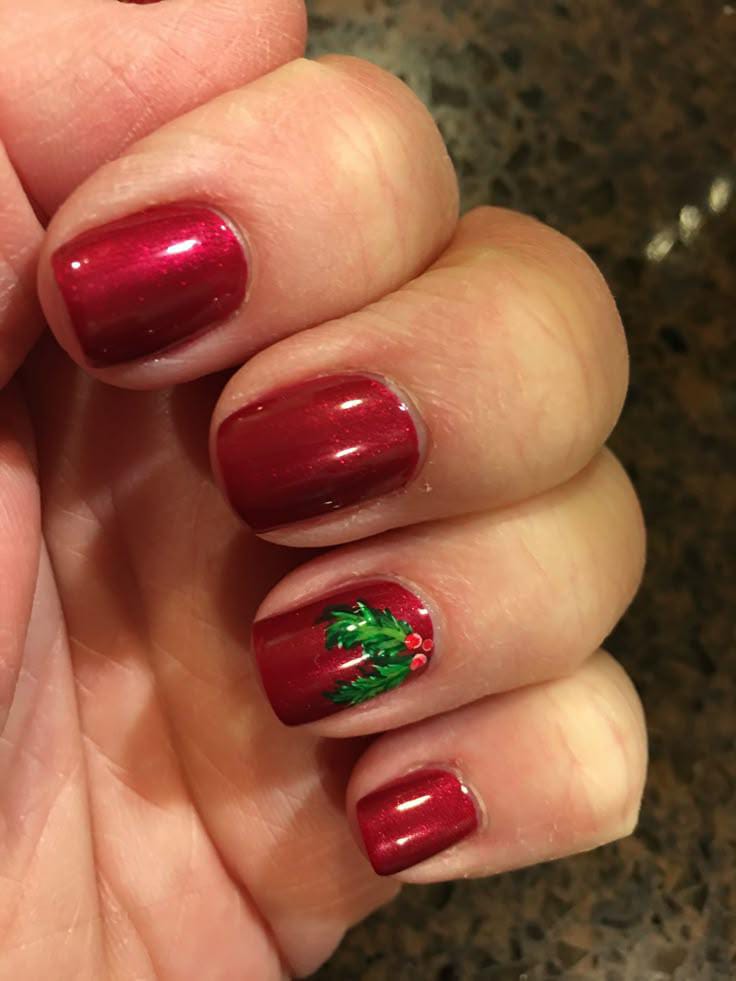 Deep red polish with a glossy shine gives this look a timeless Christmas feel, highlighted by a single accent nail featuring a delicate holly sprig for a festive touch.