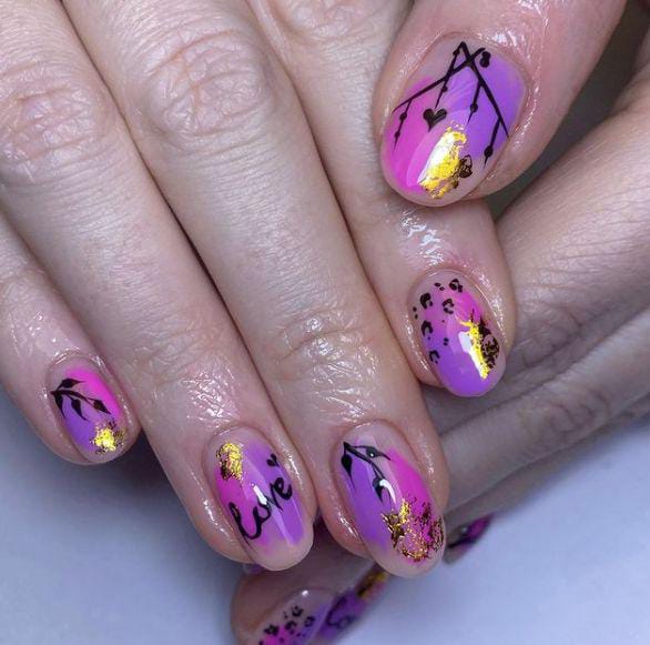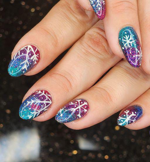 This dazzling ombre mixes jewel-toned blues, purples, and pinks with glitter and snowflake details, giving a vibrant, cosmic Christmas holiday vibe.