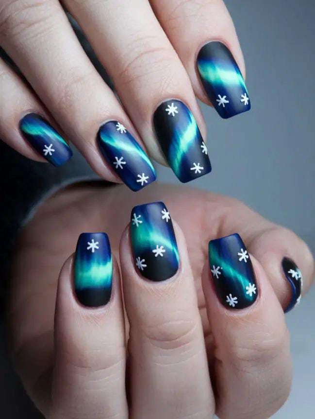 A mesmerizing blue-green ombre inspired by the aurora borealis, finished with white snowflakes that add a playful Christmas festive sparkle.
