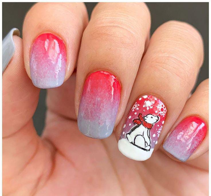 This adorable ombre nail design fades from bright red to soft lavender, capturing a cozy winter sunset. The cute polar bear accent nail with snowflakes adds a playful Christmas touch that’s both festive and sweet.