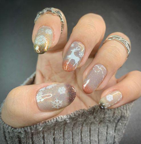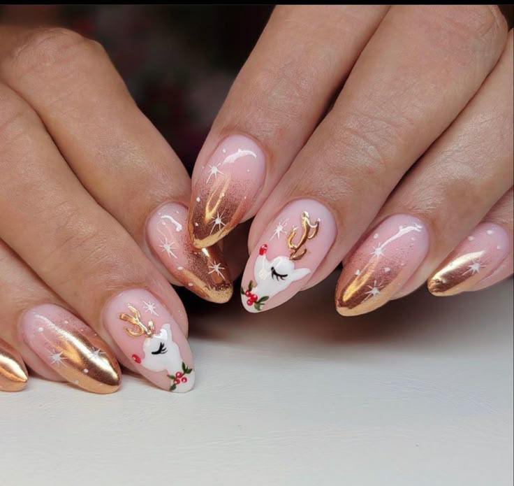 A soft blush pink base fades into golden ombre tips, highlighted by adorable reindeer art and shimmering star details. This playful yet elegant design captures the magic and joy of the Christmas holiday look.