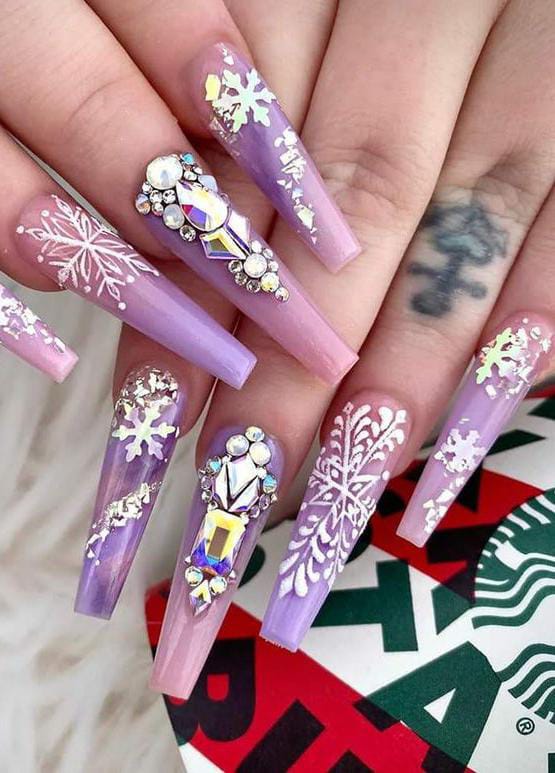 Long coffin nails in lilac and pink ombre dazzle with shimmering rhinestones and bold white snowflake patterns. This glamorous set is perfect for anyone who loves a statement Christmas look with icy sparkle.