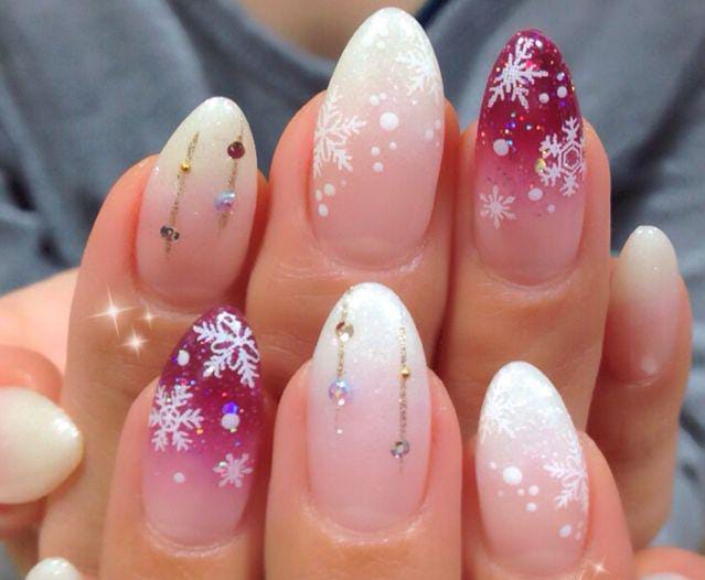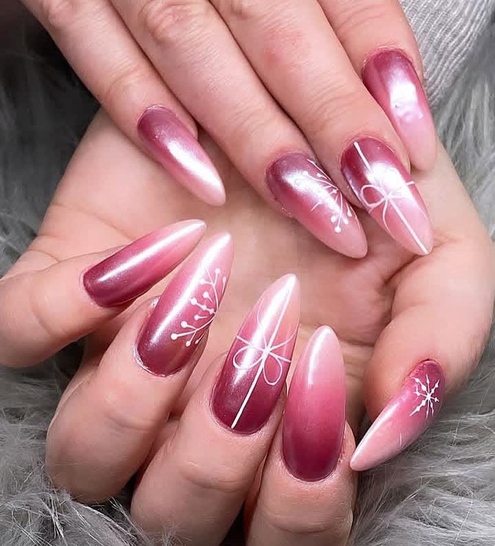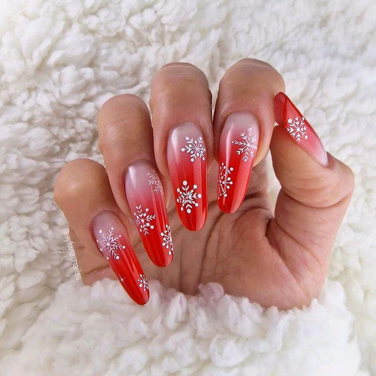 A mix of deep red, soft pink, and white ombre shades paired with snowflake details — a perfect balance of elegance and Christmas spirit.