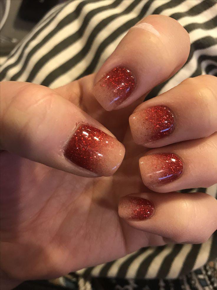 Rich red glitter melts beautifully into a soft nude base, creating a warm, glowing ombre that feels both elegant and cozy for the Christmas holidays.
