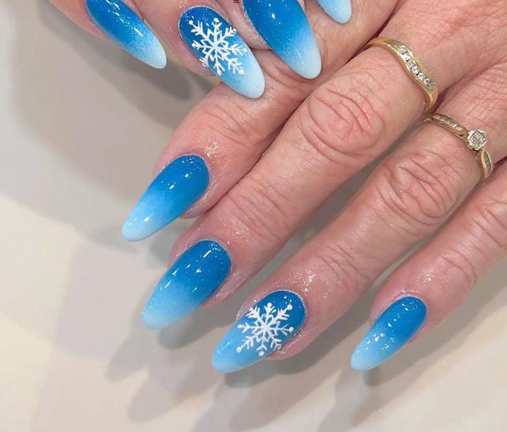 Cool blue ombre nails that fade into icy white tips, complete with crisp white snowflakes for a classic winter wonderland Christmas feel.