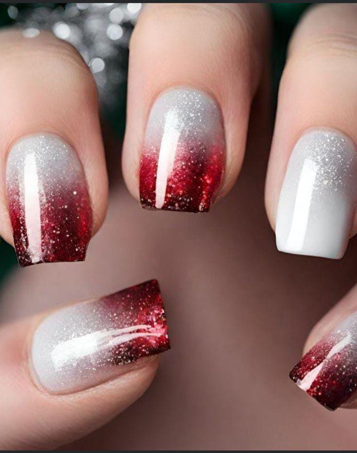 This design features a stunning red-to-white ombre that captures the cozy warmth of the Christmas holidays. The subtle shimmer and glitter dusting across the gradient give the nails a frosted, festive glow.
