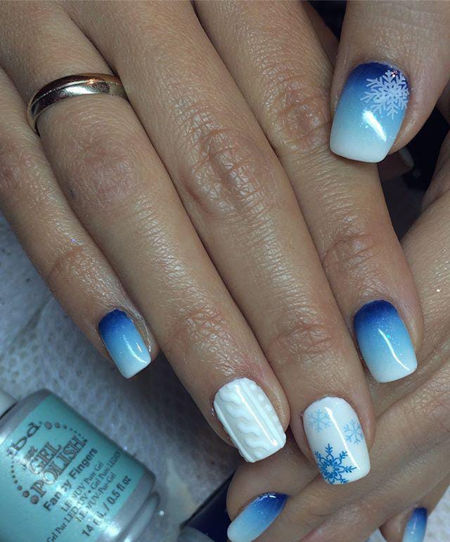 Cool blue tones blend seamlessly into crisp white tips, creating a refreshing, snowy ombre effect. Decorated with delicate snowflakes and a textured sweater-knit accent nail, this design feels like a cozy winter morning wrapped Christmas style and elegance.