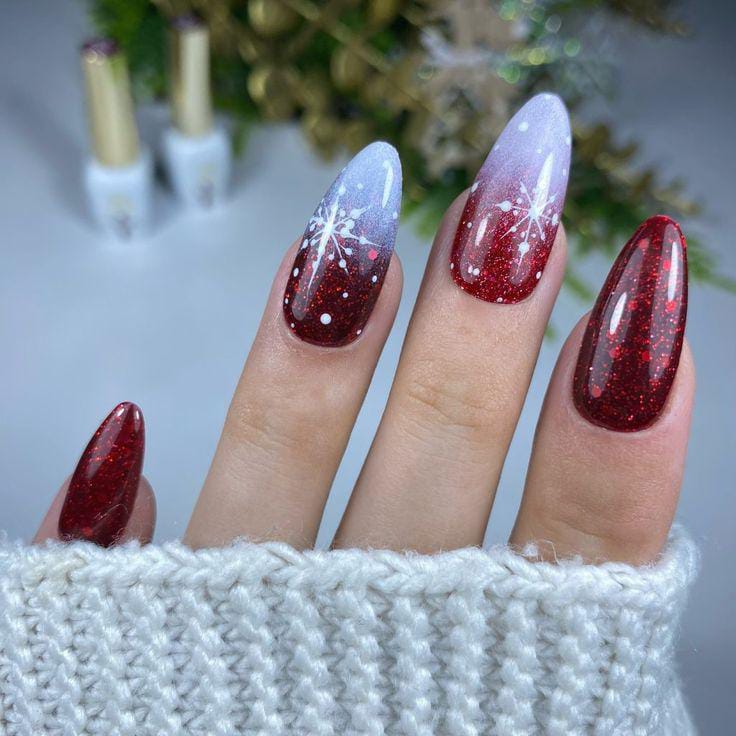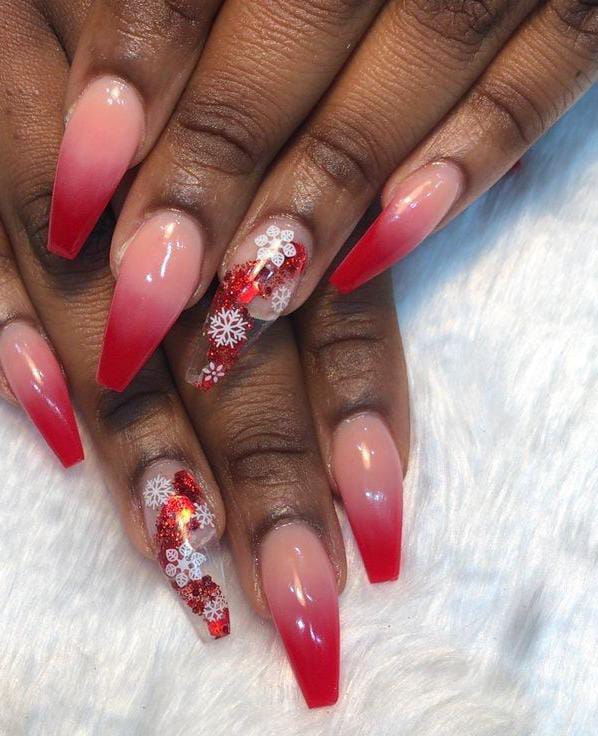 A bold red ombre transitions beautifully into a natural base, accented with sparkling glitter and intricate white snowflake patterns. This look combines classic Christmas colors with a touch of modern sophistication.