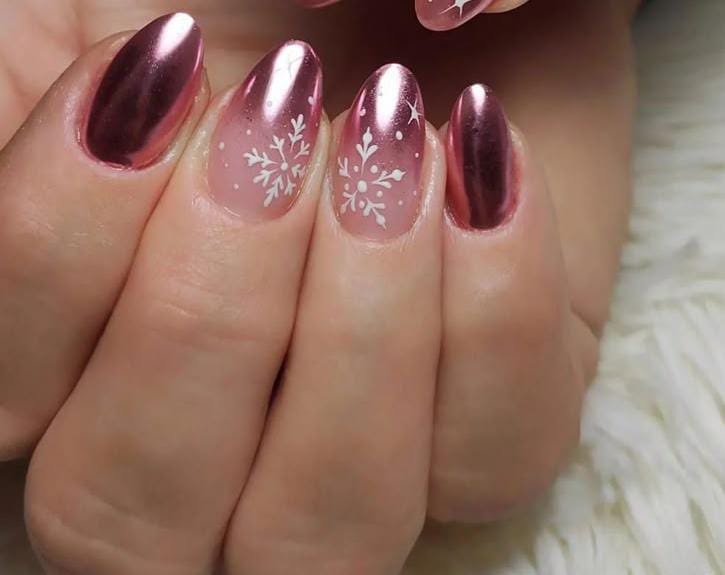 These metallic rose gold nails feature a soft ombre fade and delicate snowflake art for a chic, frosty finish. The mirrored shine adds a luxurious Christmas touch.