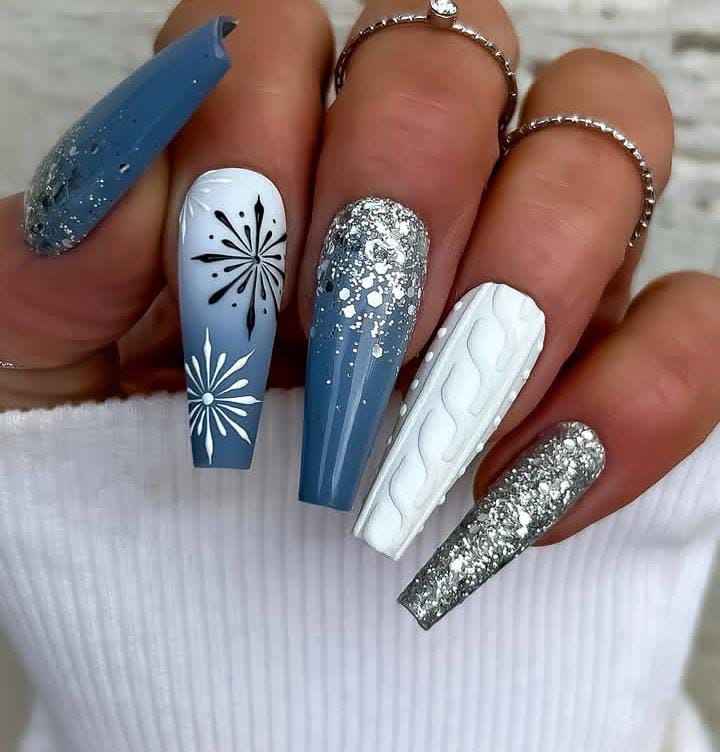 Icy blue and silver tones come together in this striking ombré design, featuring glitter gradients, snowflake motifs, and a cozy cable-knit accent nail that perfectly captures the magic of Christmas winter vibe.
