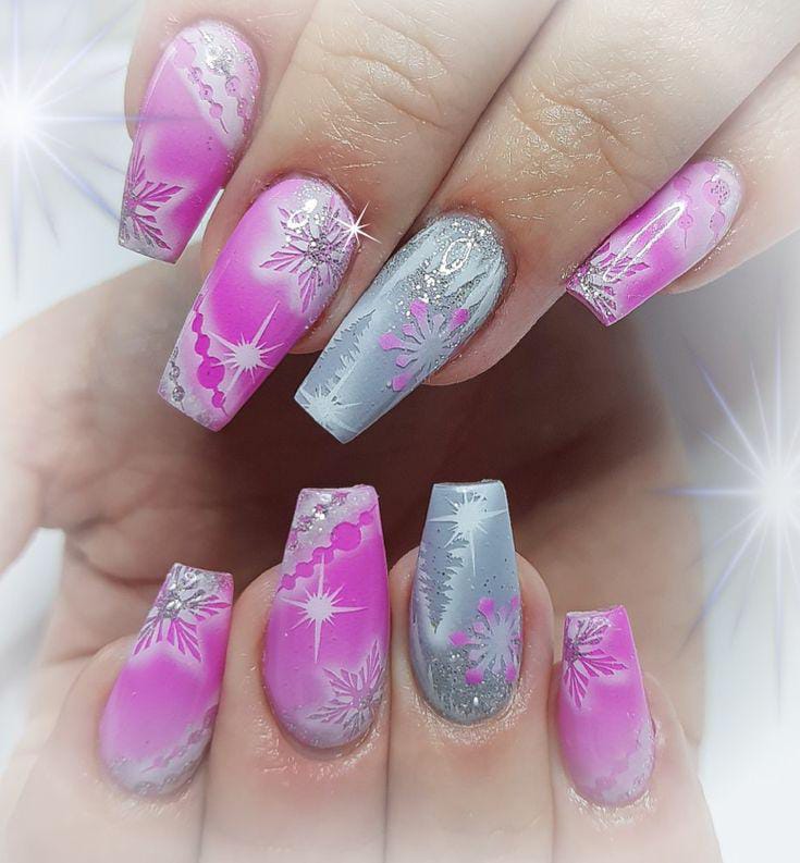 A sweet mix of pink and silver-gray ombre shades with frosty snowflake patterns, this look feels whimsical and fairytale-like for the Christmas holiday season.